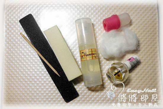 ▲準備工具:磨棒、櫸木棒、豆腐拋、卸甲液、卸甲套(或鋁箔紙)、棉花、指緣油。